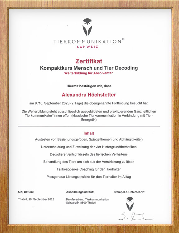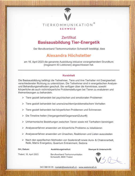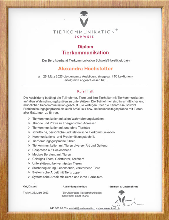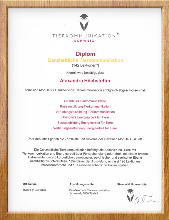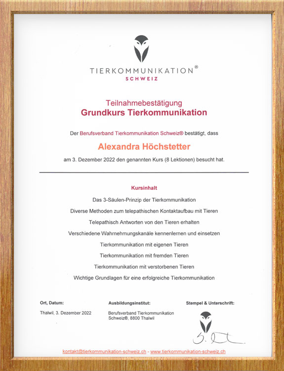 Verliehen durch den Berufsverband Tierkommunikation, Schweiz
